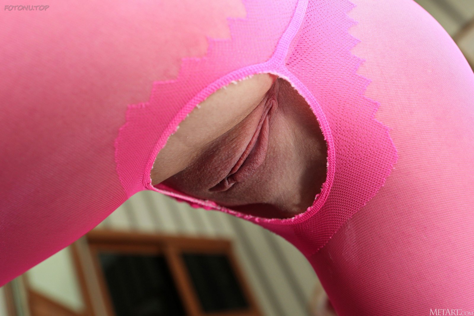 Описание: Привлекательная фитоняшка в розовых лосинах, чтобы быть в хорошей форме, регулярно занимается фитнесом. Но сегодня во время тренировки произошел небольшой конфуз, порвались лосины между ног. Прервав тренировку, сексапильная куколка пошла в спальню, где вместо того, чтобы переодеться, устроила эротическую фотосессию с дыркой в лосинах, показав свою письку, а также классные сиськи.