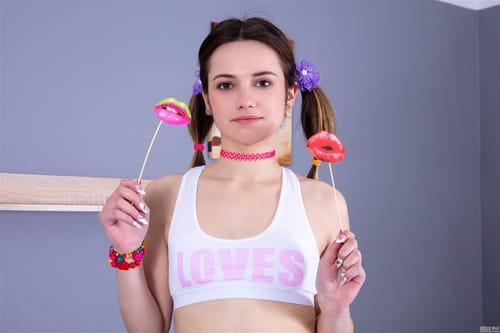 Описание: Озорная девчонка с двумя косичками на голове, надев белый топик и чулки, позирует дома на любимой кровати. Не стесняясь, она демонстрирует стройную фигурку и постоянно оттопыривает упругую попку. Но находиться в топике телка не могла долго, ведь ей хотелось оголить свой торс и показать маленькие сиськи. На этом милашка не успокоилась, ведь как она может, не показать свои гениталии, а именно свою писюшку.