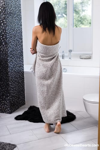Описание: Обворожительная девчонка с темными волосами, чтобы расслабиться после работы, обмотавшись полотенцем, пошла в ванную. Раздевшись догола, милашка включила камеру и начала позировать. Она любит любоваться своей красивой грудью, а так же бритой киской. А вот сильно возбудившись, милашка начала ласкать сисечки и шалить с киской, чтобы хоть как-то снять сексуальное напряжение.